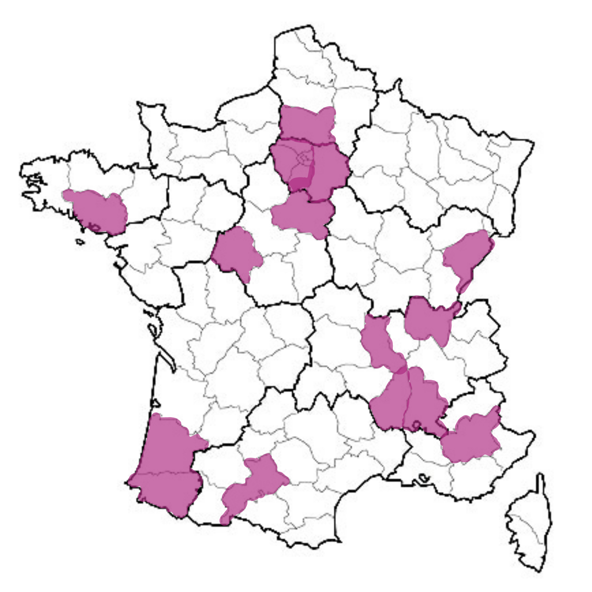 Ain, Alpes-de-Haute-Provence, Doubs, Haute-Garonne, Ile-de-France, Landes, Loire, Loiret, Pyrénées-Atlantiques
